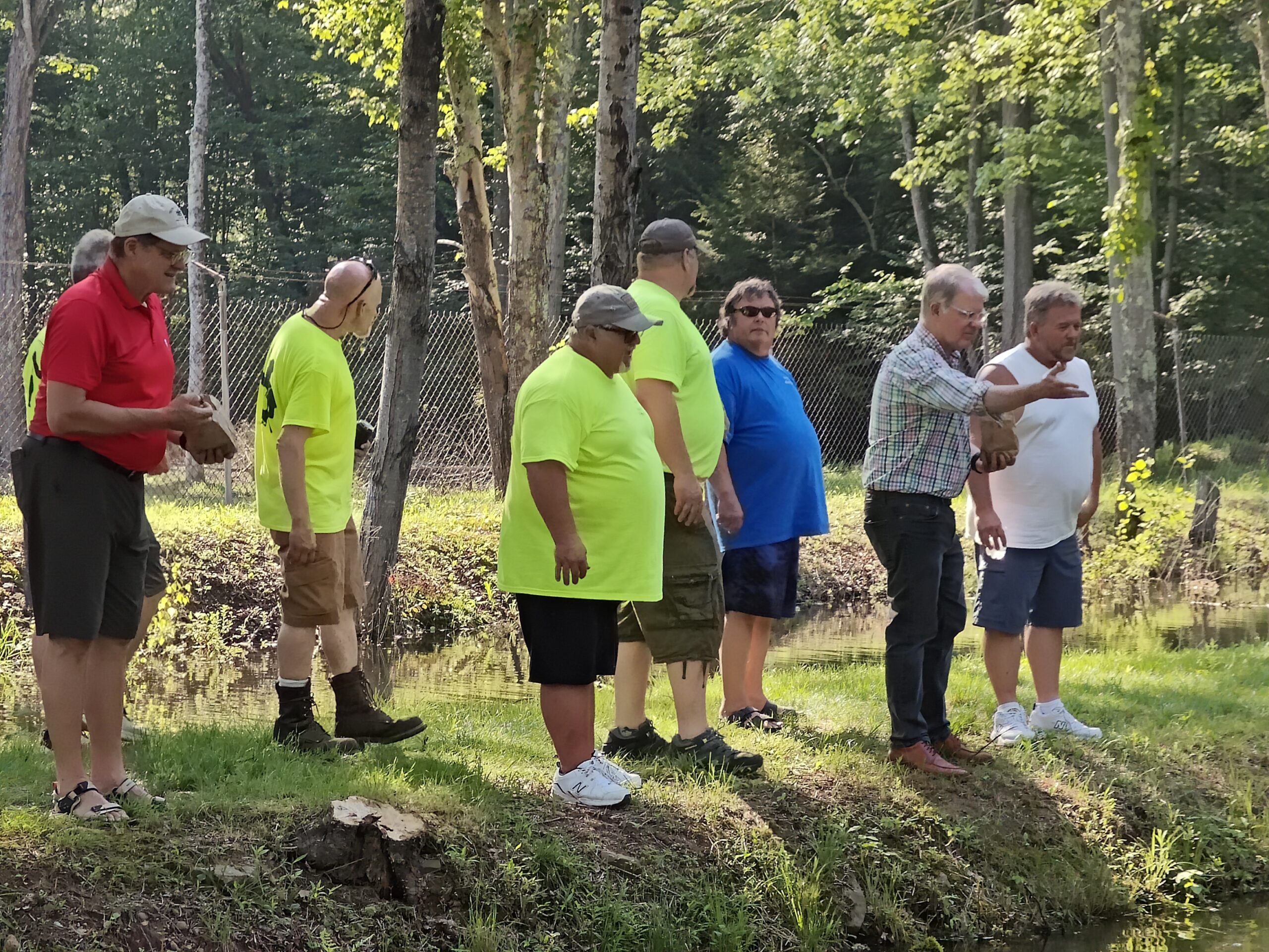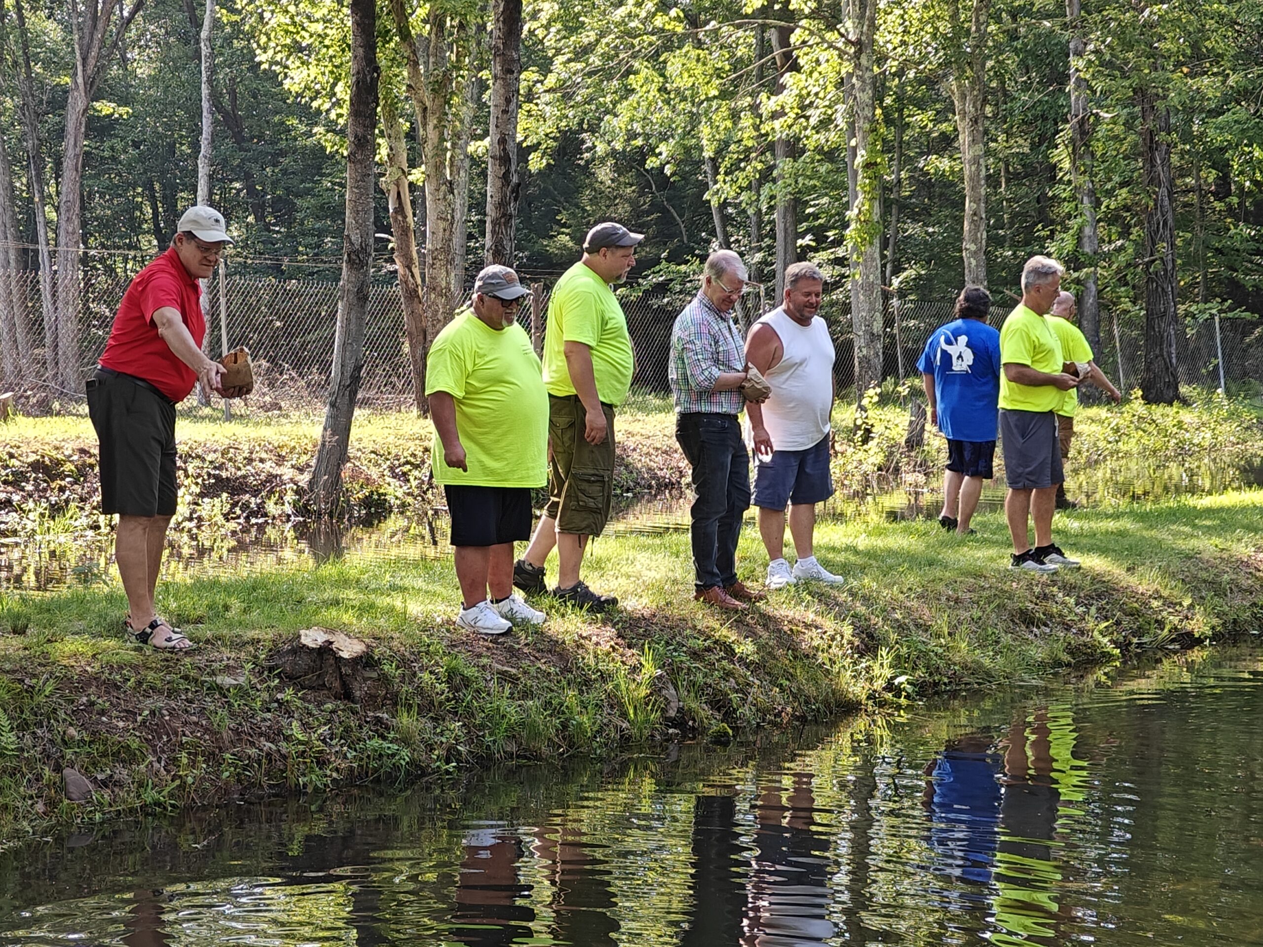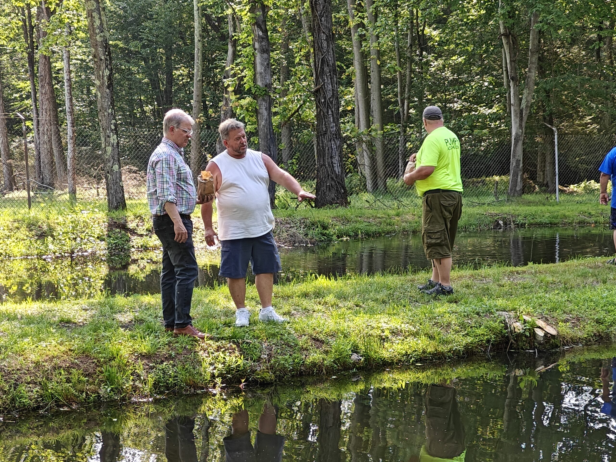 MICQUELYNN KAPUSCHINSKY / SHENANDOAH SENTINEL - Senator Dave Argall, right, tosses fish food into the hatchery at the Pumping Station Dam during a meet-and-greet Sunday, June 22, 2025. Rep. Tim Twardzik is at left